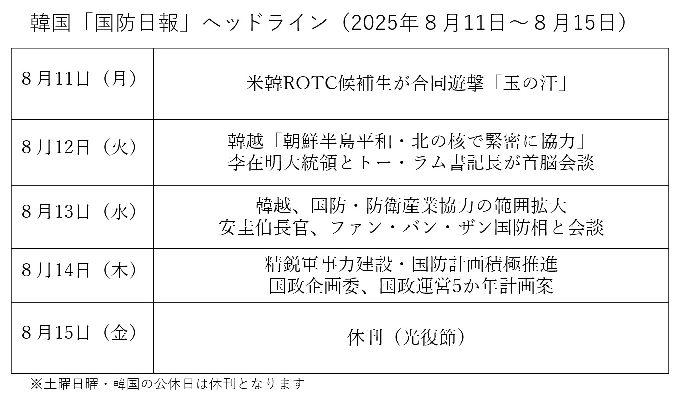 8月12日、13日のヘッドラインは、ベトナムのトー・ラム書記長と高級代表団が8月10日から13日まで訪韓したことを伝えたもの。両国は「韓国・ベトナム包括的戦略パートナーシップ関係深化のための共同声明」を採択し、国防・防衛産業協力の範囲拡大や2030年までに貿易額1500億ドル達成を目指すことなどで合意した。調印された協力文書は50件に上るという。