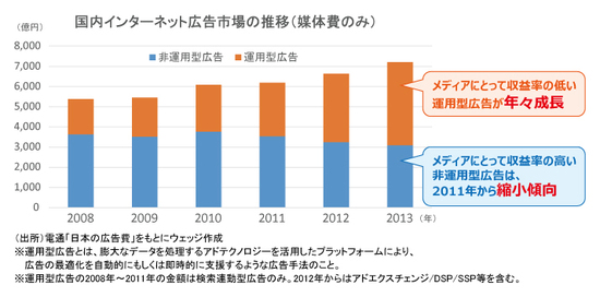 伸び続けるウェブの世界で活路を見出そうと、日本の新聞やビジネス誌はウェブメディアに力を注いできた。その多くは、無料で記事を見せて広告で稼ぐ収益モデルだが、ここ数年はアドテクノロジーを利用した「運用型広告」が伸びており、メディア側が得られる収益を目減りさせている(※下のグラフ参照)。