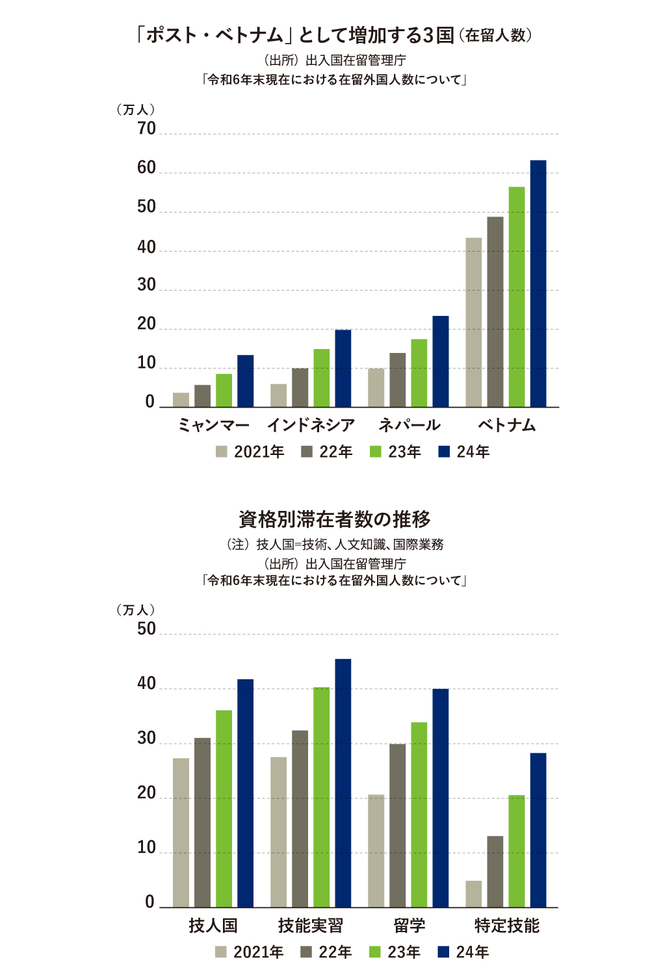 新型コロナ禍以降、在留外国人数は過去最高を更新し続けている。法務省出入国在留管理庁によれば、その数は2024年末時点で約376万人に達し、21年末からの3年間で約100万人増加した。日本人の嫌がる低賃金・重労働の仕事で深刻化している人手不足を緩和するため、政府が外国人労働者の受け入れを増やし続けているからだ。