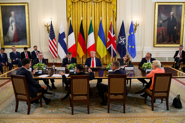 ワシントンDC大統領府で8月17日に開催された米国のトランプ大統領とウクライナのゼレンスキー大統領の二国首脳会談に続いて、欧州連合(EU)および北大西洋条約機構(NATO)首脳との会談が行われた。フォンデライエン欧州委員会委員長、ルッテNATO事務総長、スターマー英国首相、マクロン仏大統領、メルツ独首相、メローニ伊首相、ストゥブ・フィンランド大統領ら欧州首脳がトランプ大統領を囲んで議論した。