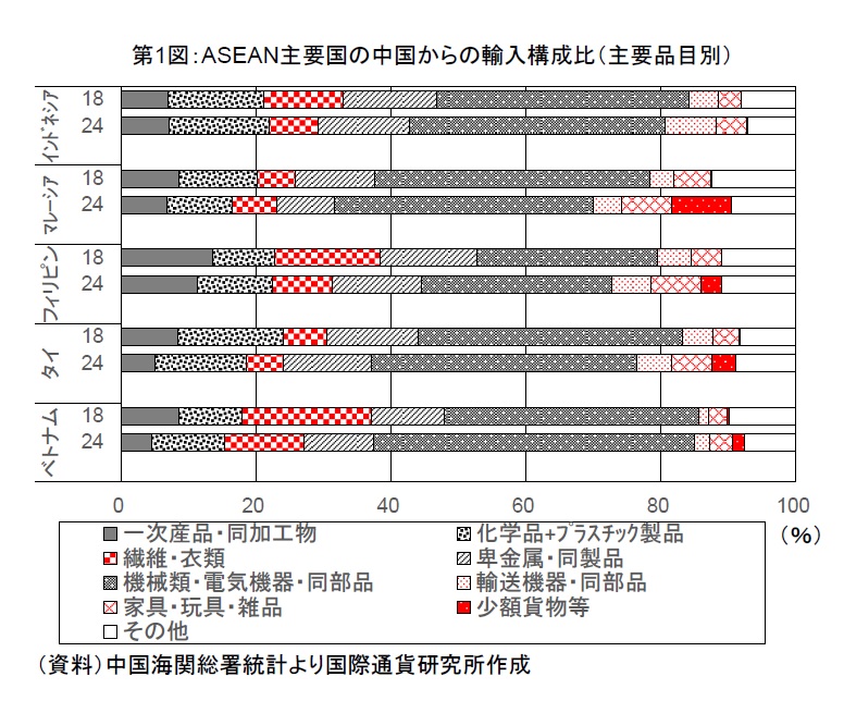 一方、安価な中国製品のさらなる流入拡大への警戒が強まっている。中国では、第1次トランプ政権が発足した2017年以降、国内における生産コストの上昇や米中対立に伴うリスク増大等を受けて、輸出先の多角化が進行している。ASEAN諸国では、中国企業の進出拡大や中国の内需の伸び悩みなどもあり、対中輸入が拡大傾向にある。ASEAN諸国の対中輸入は、従来、中間財の割合が大きいが、近年、一部の国では、輸送機械や格安越境電子商取引(EC)プラットフォームを通じた少額貨物など最終財の割合も拡大しつつある(第1図)。ASEAN各国政府は、国内産業・雇用への打撃を緩和すべく、反ダンピング(AD)措置や少額輸入品に対する課税などによる対応を強化している。