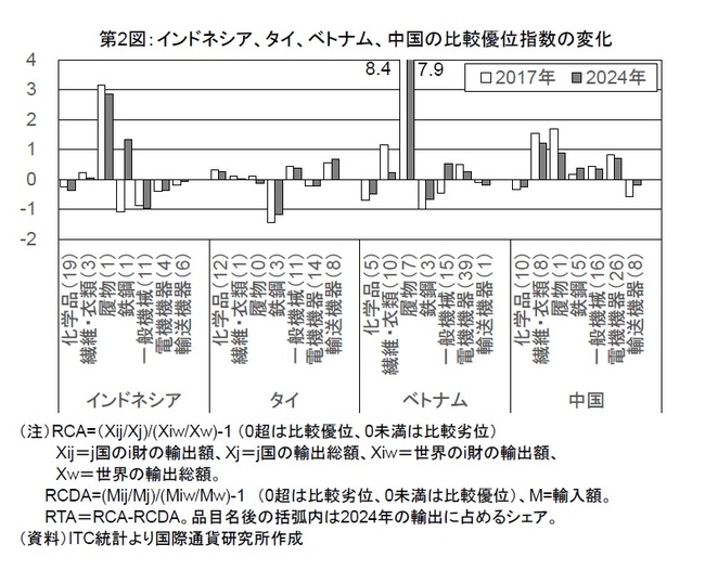 さらに、中国の米国に代わる輸出先として第三国市場におけるASEAN諸国からの輸出品との競合激化も予想される。総合的な比較優位を示す顕示貿易統合比較優位指数(RTA)(注)を用いて、インドネシア、タイ、ベトナム、中国の過去5年間の産業別の輸出競争力の変化を確認すると、履物(インドネシア、ベトナム)や輸送機械(タイ)など一部で比較優位の維持・改善がみられる一方、化学品や繊維・衣類、鉄鋼、電気機器などでは比較優位の低下あるいは比較劣位での低迷が続いており(第2図)、産業構造や輸出品目の高度化等による競争力強化が課題と言える。