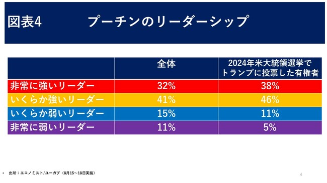 さらに、同調査では、プーチンに対する米国民の好感度は、「好感が持てる」(「非常に」と「いくらか」の合算、以下同)が8%、「好感が持てない」が82%であった(図表3)。ただ、全体で73%が、プーチンを「強いリーダー」と捉えている(図表4)。ちなみに、2024年米大統領選挙でトランプに投票した有権者に限ってみると、84%がプーチンは強いリーダーであると答え、全体よりも11ポイント上回った。