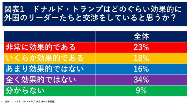 米世論は、トランプの交渉能力と米ロ首脳会談をどのように見たのだろうか。英誌エコノミストと調査会社ユーガブによる全国世論調査(8月15~18日実施)によれば、「ドナルド・トランプは、どのぐらい効果的に外国のリーダーたちと交渉をしていると思うか」という質問に対して、23%が「非常に効果的である」、18%が「いくらか効果的である」、16%が「あまり効果的ではない」、34%が「全く効果的ではない」、9%が「分からない」と回答した(図表1)。
