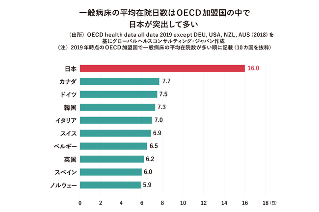 A2 日本の平均在院日数は諸外国の2倍以上となる16日となっています。「日本は手厚い」とポジティブに受け取る方もいるかもしれませんが、「患者のため」というよりも、「病院経営のため」という面があるのも事実です。