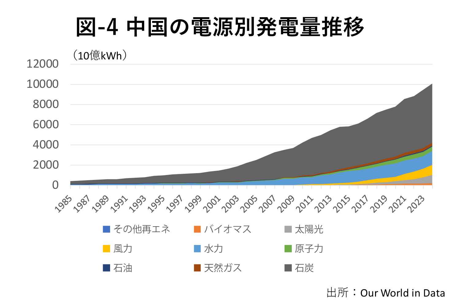 世界の石炭火力の発電量のシェアは35%だが、世界最大の電力消費国で世界の発電量の約3分の1を持つ中国の石炭火力発電量は伸び続け、いま6割のシェアを持つ(図-4)。