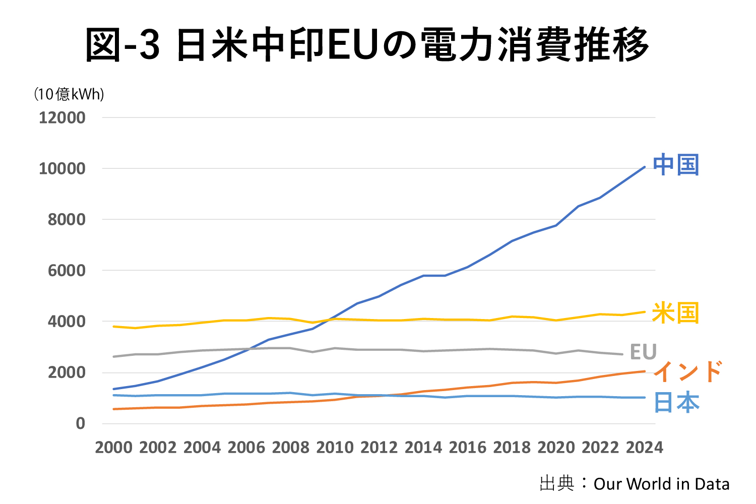 中国、インドなどの途上国の電力需要は成長を続けている。一方、先進国の電力需要は、省エネ機器の利用が進んだこともあり、頭打ちだったが(図-3)、生成AIが電力需要の構造を大きく変えつつある。