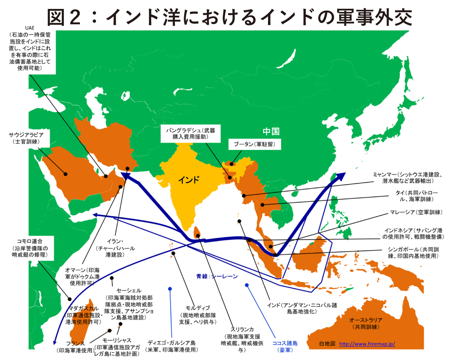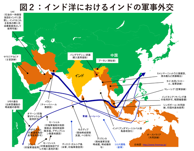 インドは、マラッカ海峡の出入り口にあたるアンダマン・ニコバル諸島の軍事基地の強化を進めており、マダガスカルやモーリシャスなどにも拠点を持つ。さらに、イエメンのフーシ派対策でも、大規模に海軍艦艇を派遣してシーレーン防衛にあたっているため、インド洋での大きな存在感を示しつつある。