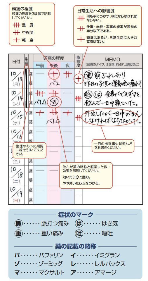 私はまず患者に自由な形式で書いてもらうことを好むが、既製のフォーマットを利用したい場合には、インターネットでいくつか入手できる。日本頭痛学会のもの(図)もある。