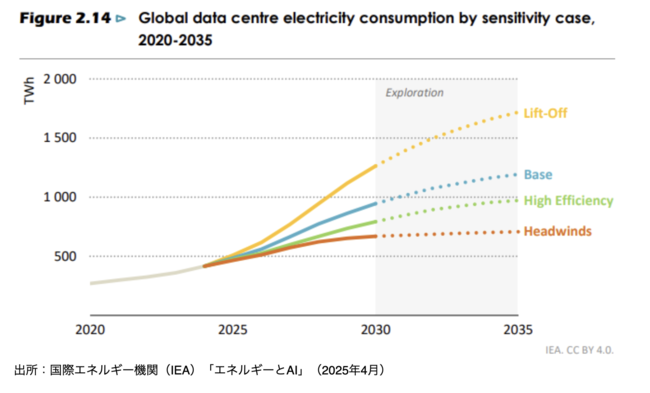 国際エネルギー機関(IEA)は「エネルギーとAI」(2025年4月)(以下翻訳は筆者による)で、世界のデータセンターの電力消費量は2030年までに945 TWhと2024年の約2倍に増加するとの予測を示した(ベースケース)。2030年にかけた電力消費量は約15%のペースで増加し、他のすべての産業部門の電力消費量の増加率の約4倍の速さで増加する見通しだ。