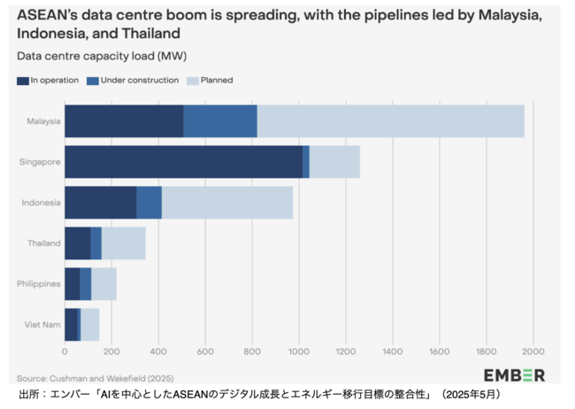 英エネルギーシンクタンクのエンバー「AIを中心としたASEANのデジタル成長とエネルギー移行目標の整合性」(2025年5月)によると、世界のデータセンターの約45%が現在は米国に存在するが、2028年までにアジア太平洋地域が世界総容量の34%を占め、そのパイプラインの51%をASEANが占めると予想されている。