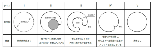 II:損傷した(焼け焦げた)幹や枝の一部を樹皮が巻き込んで開口部分を塞いでいるもの