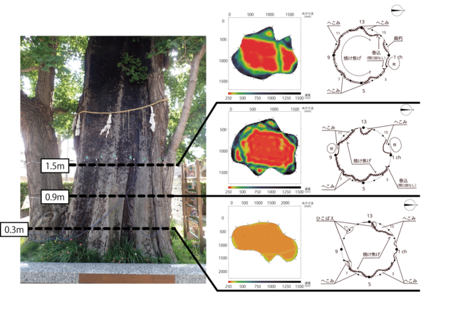 例えば、次のイチョウは、根元から先端まで幹が黒く焼け焦げ、地震や戦争で被害を受けた樹木の典型的な特徴を有している。腐朽・空洞率は0.3m で41.6%、0.9mで43%、1.5mで32.4%と腐朽の兆候が見られるものの、その周りに成長した健康な外樹皮が樹木全体を支えていることが示された。