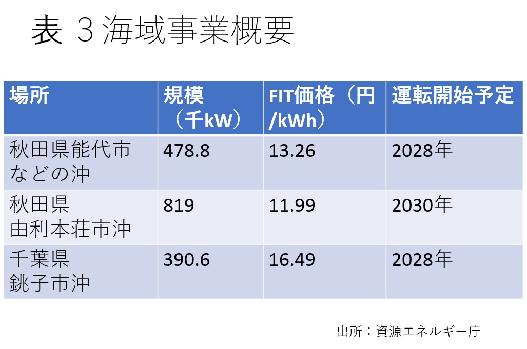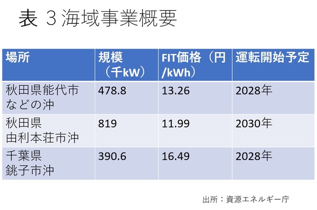 三菱商事グループが落札した3事業の概要は表の通りだ。落札額を見ると3事業の条件は異なるのだろうが、ここでは総発電設備容量を169万kWとして計算する。