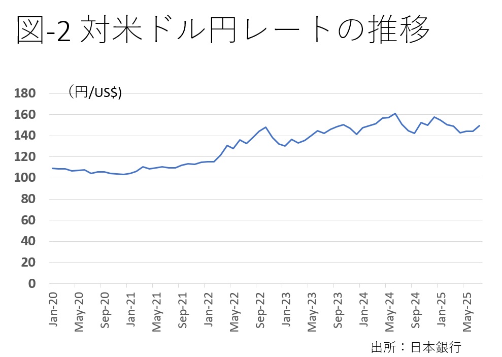 欧州中銀、FRBが金利を引き上げたにもかかわらず、日本銀行が金利を据え置いた結果、大きな円安を招いた。図-2が円の対ドルレートの推移を示している。21年1月の1ドル105円は、24年6月には一時160円を超えるほどの円安になった。