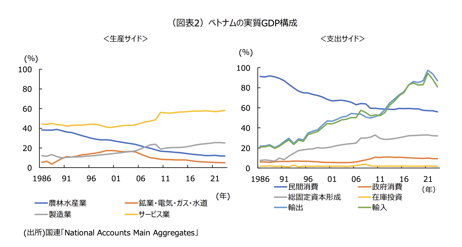 まず、生産サイドでみてみると、86年の実質GDPに占める製造業の割合(工業化率)は12.0%にすぎなかったが、23年には25.1%に上昇している。これはベトナムより先発して工業化で発展したマレーシア、タイが同程度の所得水準であった時と比較しても決して見劣りしない水準(マレーシア:23.6%、タイ:29.8%)である。この工業化で生み出された製品はベトナム国内よりも海外に供給された。実質GDPに占める輸出の割合は90年頃から順調に上昇を続け、リーマン・ショック以降はそのペースを一段と急なものにし、23年には87.0%に達している。