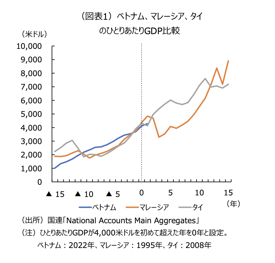 国際連合のデータベース「National Accounts Main Aggregates Database」によると、2023年のベトナムのひとりあたりGDPは4282米ドルであった。リーマン・ショック時には1000ドル強であったことから考えると、ベトナムは約15年で4倍近く所得水準を上昇させたことになる。この成長ペースは、ベトナムより先発して工業化で発展したマレーシアやタイの歩んだペースと比較しても遜色なく(図表1)、ベトナム経済は順調な成長を遂げている、と捉えて差し支えないであろう。
