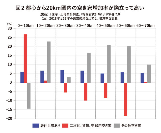 次に、日本で起きている「奇妙な現象」に注目しよう。東京圏において、空き家住宅が89.8万戸、うち賃貸・売却用および二次的住宅を除く空き家が21.5万戸も存在している。東京圏の都心からの距離帯別に18~23年にかけて、どのような住宅が増加したかを図2でみてみよう。