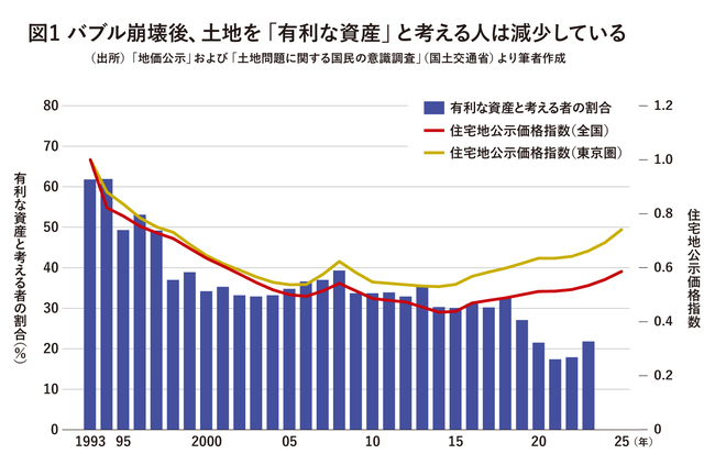 日本では、長い間「土地神話」があったとされる。図1には「土地は有利な資産か」という問いに対して、「そう思う」と回答した者の割合と、1993年の住宅地の地価公示価格を1とした場合の指数の変化を示している。バブル崩壊を経て地価下落が長時間継続することで、資産としての不動産に強い選好を示す傾向は大きく減少している。
