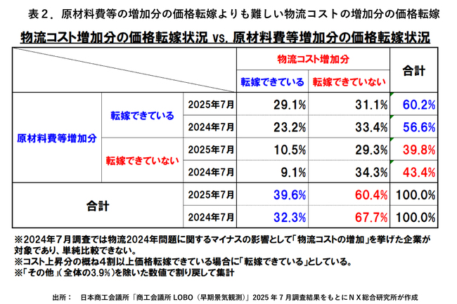 日本商工会議所がLOBO調査の一環として、原材料費等増加分と物流コスト増加分について価格転嫁できているか否かを、24年7月と25年7月に荷主企業と物流企業へ行った調査結果である。原材料費等増加分の価格転嫁に比べて、物流コスト増加分の価格転嫁が荷主企業にとっても物流企業にとってもはるかに困難であることが否定できない。