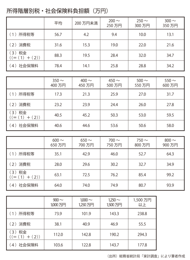 総務省統計局「家計調査」を用いて、仮想例ではない現実の所得税や消費税、社会保険料の所得階層別・世代別の負担額の違いを見てみることとしたい。