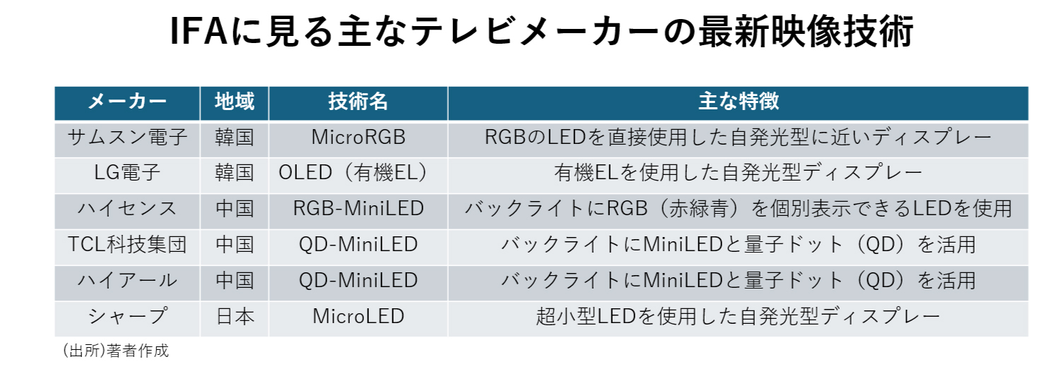 テレビの映像技術はかつてシャープが世界の液晶技術を牽引し、パナソニックがプラズマディスプレー技術を主導したが、そうした映像技術の開発競争は日本メーカーから韓国と中国メーカーの手に移ってしまった。世界のテレビ市場では、コントラストが高く、黒がきれいに映る自発光型のOLED(有機EL)技術でLGが優位に立つが、その構図を崩そうとライバル企業が別の技術で競争を挑んでいる。