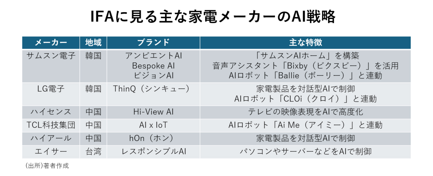 一方、家電分野へのAIの活用はアマゾンが14年に発表した音声アシスタントの「Alexa(アレクサ)」がきっかけで、この分野で先行したのはサムスンとLGだ。サムスンは「Bixby(ビクスビー)」という音声アシスタントを投入、LGは「ThinQ(シンキュー)」というAIブランドを起ち上げ、様々な家電製品を音声で操作できるようにした。米オープンAIが22年に生成AIの「ChatGPT」を発表すると、その勢いは増し、AIエージェント技術を活用したAIロボットも登場した。