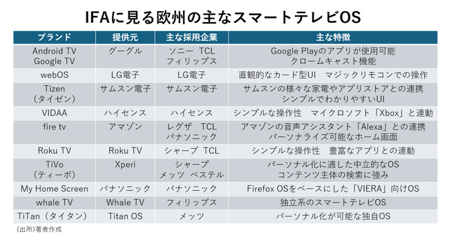 ところが米アマゾン・ドット・コムが「fire(ファイア)TV」を発表し、米配信技術会社の「Roku TV」や「TiVo」などがこの分野に参戦すると、ハイセンスは「VIDAA(ヴィダ)」と名付けた独自OSで対抗、IFAを舞台にスマートテレビの様々な技術競争が展開されている。