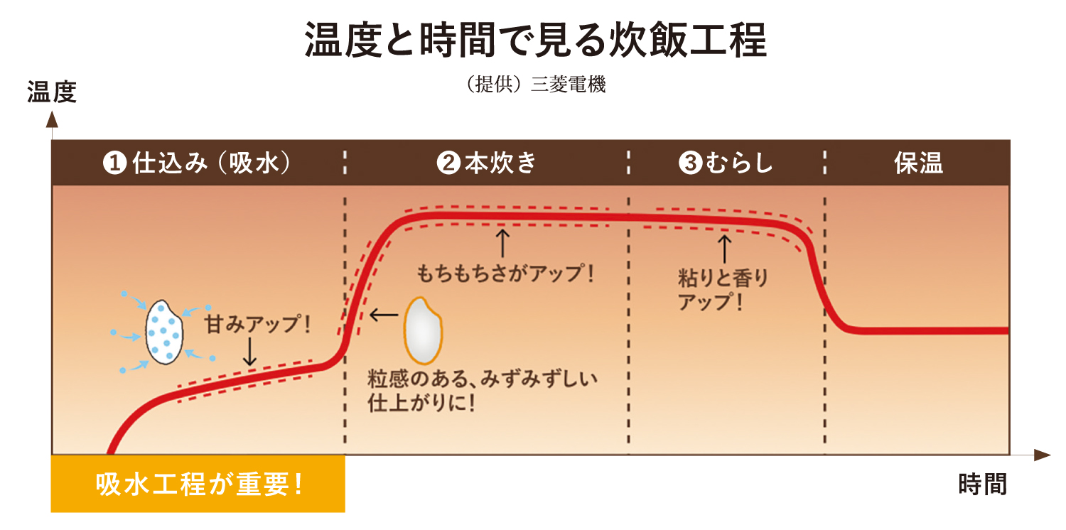 炊飯は、ざっくり「浸水」「沸騰」「蒸らし」の3工程に分かれる。沸騰工程は、コメの中の「βデンプン」を、人間が吸収できる「αデンプン」にする。α化(のり化)は、人がコメを栄養として摂取できるようにする重要な工程だ。コメ内のデンプンをα化させるには98℃以上で、20分以上の沸騰が必要とされる。そして甘味はデンプンが、だ液などで糖化することにより強く出る。強沸騰はおいしさの大きな鍵だ。
