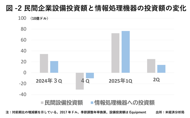 民間の設備投資額の伸びもデータセンターへの投資額が支えているようだ(図-2)。情報処理機器への投資額は年率換算で6000億ドル(90兆円)を超えている。