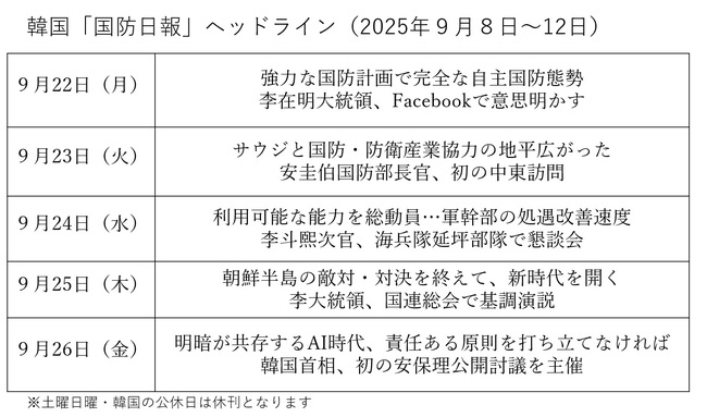 韓国海軍は9月26日、創建80周年を記念した「2025大韓民国海軍観艦式」を釜山沖の海域で開催した。25日から27日まで付帯行事を含めて行われた観艦式は今回で6回目。スローガン「国民とともに強い海軍」は、李在明政権を強く意識したものだった。ヘッドラインではないが、国防日報は23日付紙面で詳細を伝えた。