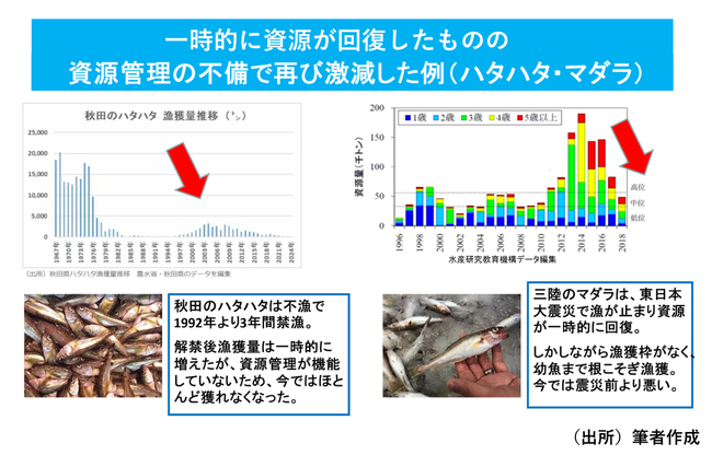 過去の歴史をたどると、日本ではせっかく回復した資源をつぶしてしまった例が数多く存在します。左は秋田のハタハタの例です。資源量が激減してしまい92年より3年間禁漁。禁漁で資源が少し回復したものの、資源管理制度の不備で獲り過ぎてしまい元の木阿弥となりました。