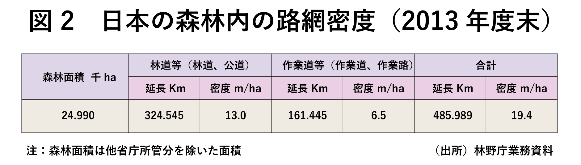 全国2500万ヘクタールに20メートル/ヘクタールの林道整備を目標にしていたが、年間の新設量は300キロメートル(2012年度)程度で、林道密度にすれば0.012メートルの伸びに過ぎない。これではほとんど永久に目標は達成できないと思ったのか、最近では行政が林道に作業道等を加え路網という概念を取り入れて、何とか整備の遅れをカバーしようと苦心しているようだ。