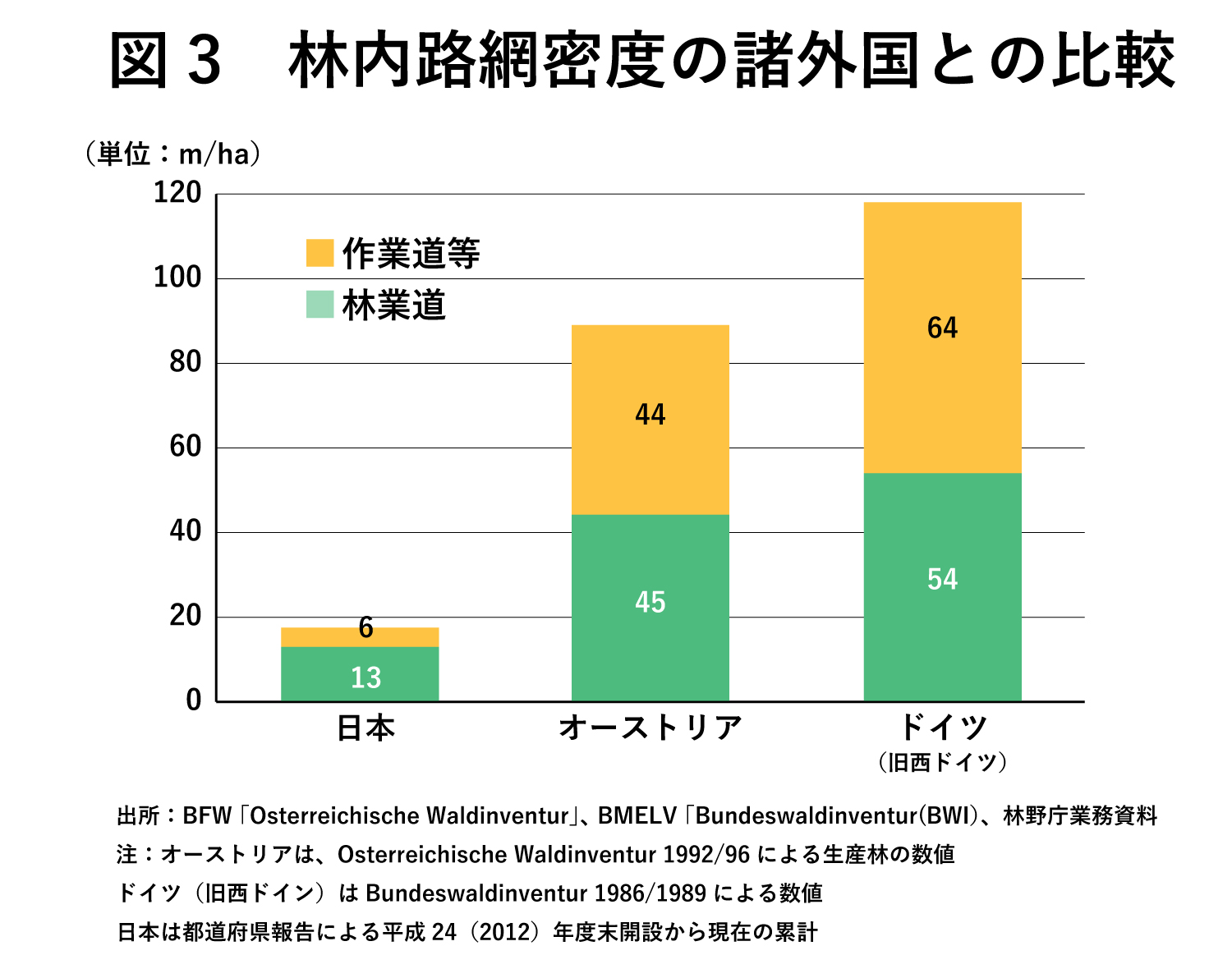 ここで林業の盛んなオーストリア、ドイツと比較してみたのが、図3である。路網密度の圧倒的な違いもさることながら、緑色の林道の部分の差が決定的なのである。