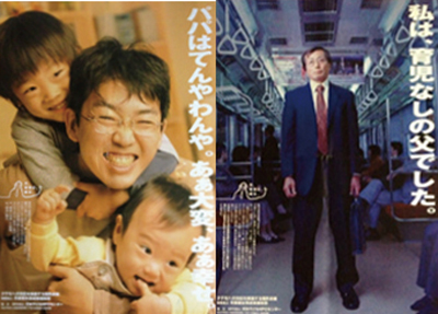 「父、育児に帰る。」啓発ポスター。少子化への対応を推進する国民会議制作、2003年