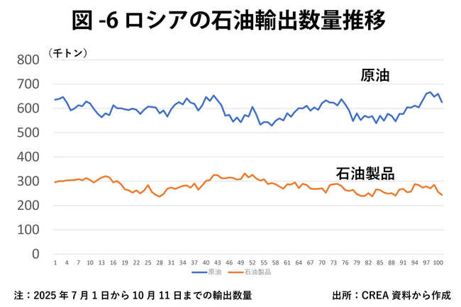 欧州のシンクタンクCREA(Center for Research and Clean Air)はロシアの化石燃料収入の分析を続けている。CREAによると、9月のロシアの化石燃料輸出収入は前月比4%減の1日当たり5億4600万ユーロ(約950億円)となり(図-5)、ウクライナ侵攻以降最低になった。