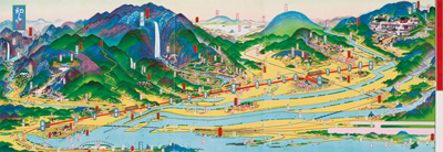 今回の展示では、2件の原画をはじめ、大正から昭和前期にかけて発行された鳥瞰図、ポスター、それに往時の切符や絵葉書、時刻表など鉄道や観光関連の資料全307件が紹介される。その大半が、愛知県一宮市出身で、鳥瞰図の収集と研究に打ち込んだ小川文太郎氏のコレクションだ。会場には同氏が旅先で入手し、収集のきっかけとなった「養老電鉄沿線名所図絵」など、北海道から九州まで全国各地の観光案内図が並ぶ。時を超えて旅情を誘う作品を通して、かつての観光の旅へと思いを馳せてみたい。
