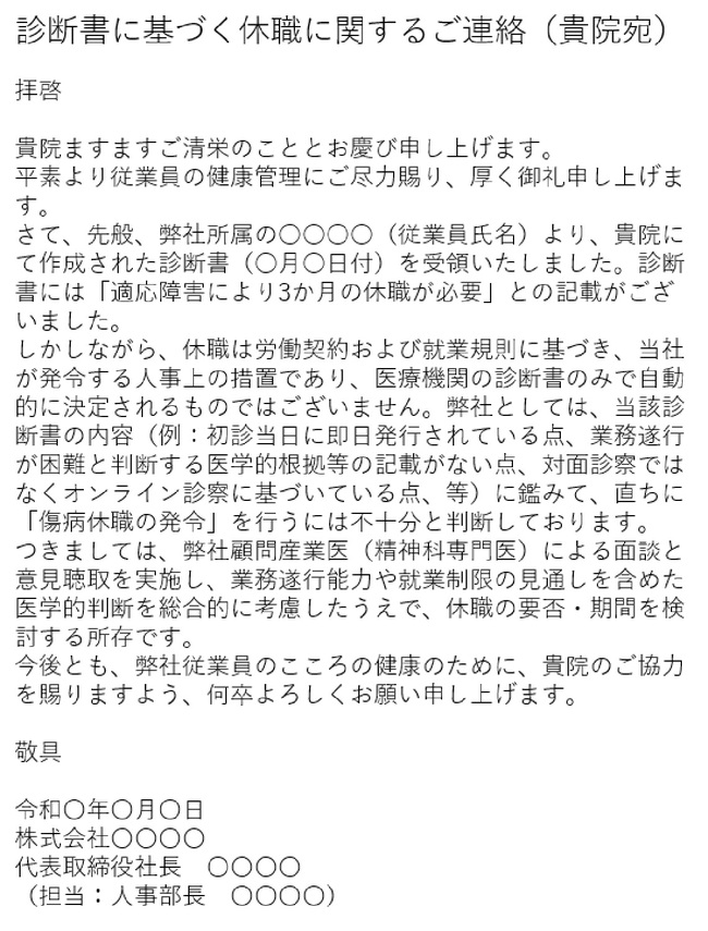 代表取締役名で、人事部に以下のような返書を書かせて、主治医宛に送付すればよい。その目的は、人事権を持つ立場として、休職に至る社内プロセスを丁寧に、しかし、毅然とした文体で、伝えることにある。そこで言外に込めるべきメッセージは、「医者に人事権などない」という自明の事実である。