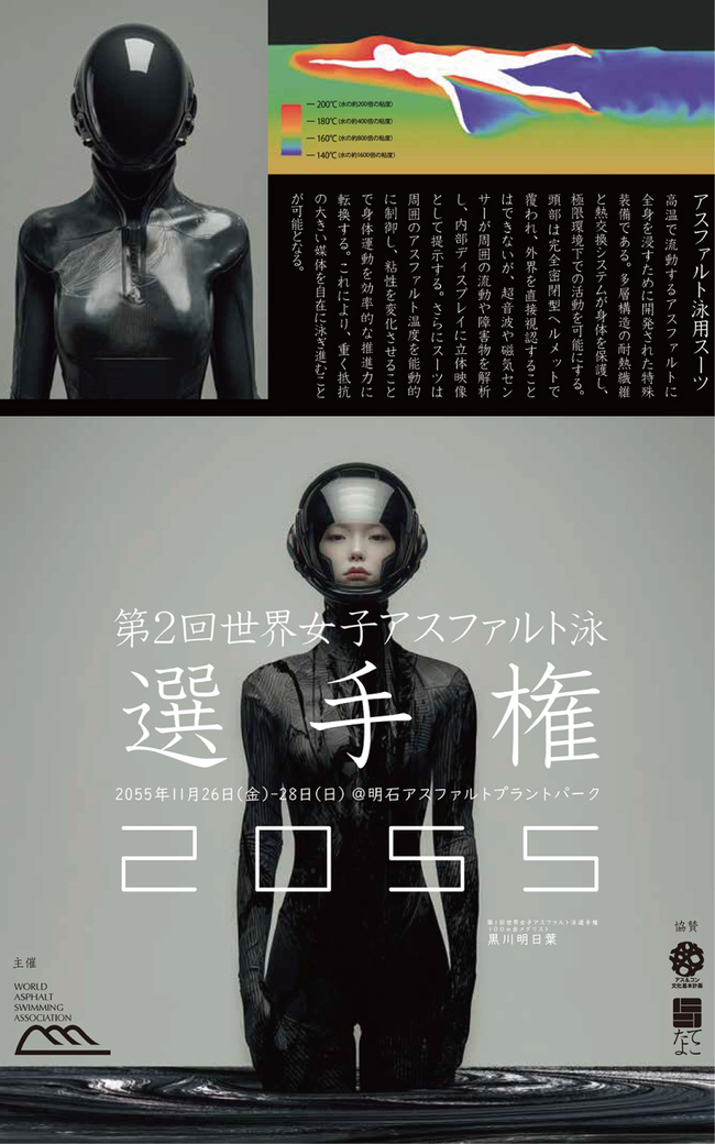 「土木構造物は、私たちの身近にあっても、肌で触れるような機会は少ない。もっと、親しみを持ってもらえないか……」。参加者の一人がつぶやいたそんな一言から出た発想の一例が、アスファルトの中を泳ぐ「世界女子アスファルト泳選手権2055」だ。