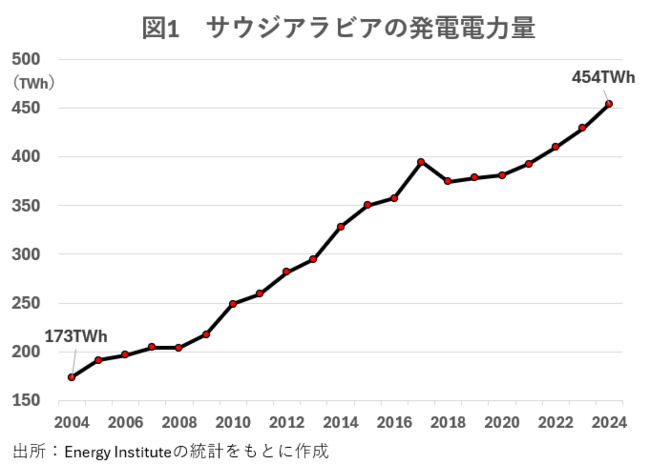 一方、サウジアラビアは他の中東諸国と同様に、急増する電力需要への対応という課題を抱えている。同国の発電量は04年から24年の間に173テラワット時(TWh)から454TWhへと大幅に増加し(図1)、この10年間の年間平均増加率は5.6%に達した。