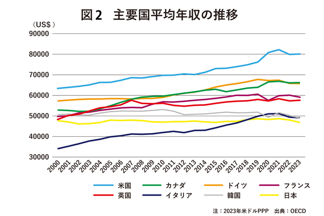 民間企業の平均給与は過去最高の1997年のレベルを2025年8月時点では下回ったままだ。他国は成長が続き、給与も伸びたため、日本人の平均給与はG7国の中で2000年頃に最下位となり、いまは韓国にも抜かれてしまった。