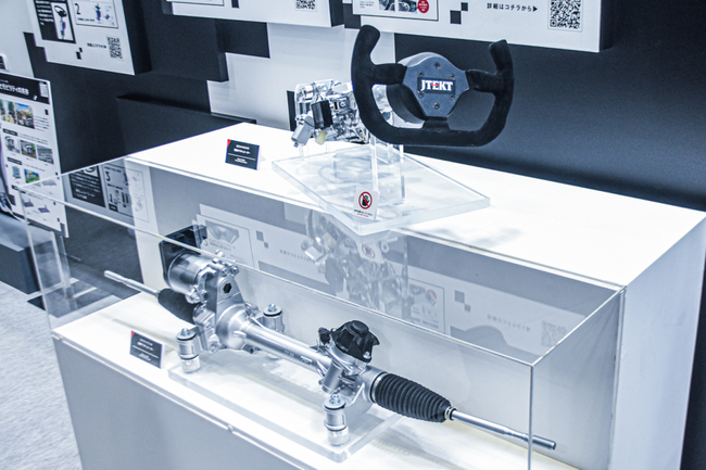 ジェイテクト(愛知県刈谷市)は「曲がる機能」を担う新しいステアリングとして「ステアバイワイヤ」を展示している。ステアリングはハンドルの回した方向をタイヤに伝え、車両の走行方向を操作させる。ハンドル操作を伝える操舵ユニットとタイヤを動かす転舵ユニットがシャフトでつながっているのが一般的だ。