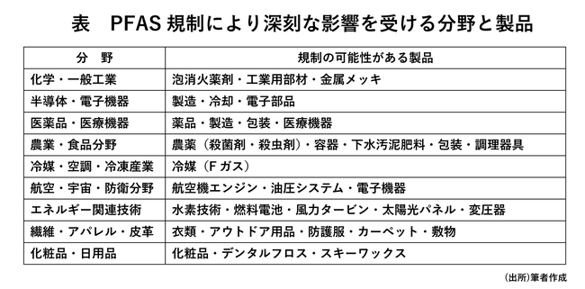 影響を受ける分野と、規制される可能性がある製品を表に示す。これらの製品がすべて規制されれば、通常の社会生活はもとより、医療も、食料生産も、産業活動もほとんどが止まってしまうことが理解できるだろう。