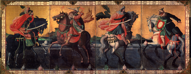 きらびやかな金地に4人の西洋の騎士たちのダイナミックな戦闘場面を描いた4曲1双の図屏風である。