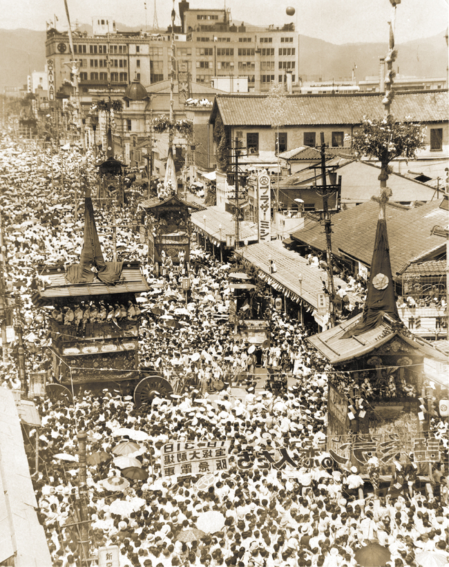 京都でも戦争の影響はありました。御池通、堀川通、五条通は道路の幅がすごく広い。45年に、防空対策のために火除け地として、広げたからです。地図で上から見れば、今あげた三つの通りが『匚(はこがまえ)』を構成しています。つまり、祇園祭の地区を防火帯でとりまき守っているようにも見える。火除け地を通すなら室町通でも、錦でもいいはずです。だけど、祇園祭の地区を囲むようにした。大日本帝国陸軍も、祇園祭には忖度したんやね。こうやって、あの洛中のまちは守られたわけです。