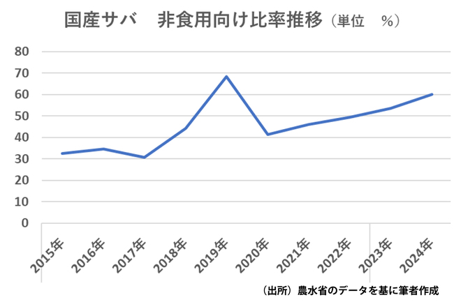 下のグラフは、国産サバの内、食用ではなく養殖などの非食用向けになっている比率の推移です。日本がノルウェーからサバを原料で輸入している数量は約5万トンです(24年4万7663トン)。