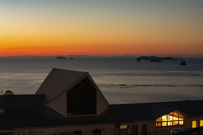 文学館の立つ高台からの海の眺めは絶景である。見晴るかす角力灘にオレンジの陽が落ちてゆく。こんな夕陽を見ることは、もう生涯ないだろうなと感じる。生前に建てられた「沈黙の碑」に遠藤はこんな言葉を遺している。