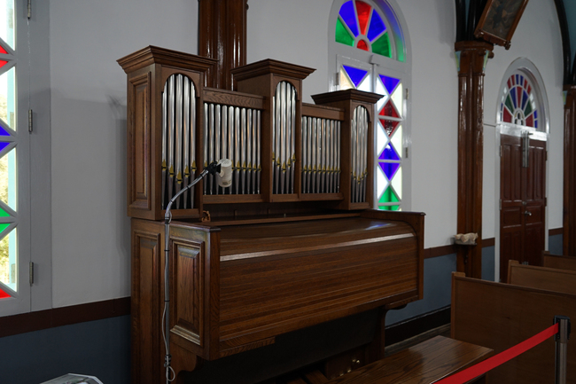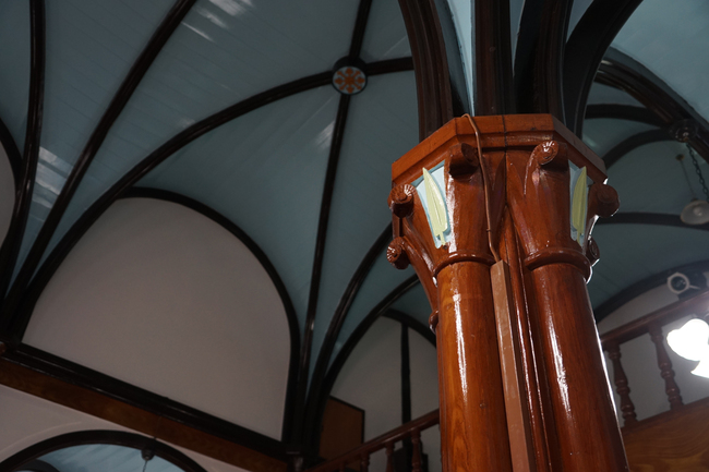 入り口前のマリア像の出迎えを受けて中に入ると、まず驚かされるのはその広さである。奥の祭壇に向けて長い身廊が延び、側廊にはステンドグラスも鮮やかな高窓が連なる。柱廊の太い柱は磨き込まれて美しい光沢を発し、リブ・ヴォールト天井を支える梁材は見事なアーチを描き出している。おそらくは教会など見たこともなかった人々の手でなされたこの建築に、どれほどの宗教的な情熱が注がれたことか。祭壇ではフランスからもたらされたキリスト像とマリア像が、高みから温かい目を注ぎかけてくる。