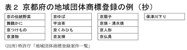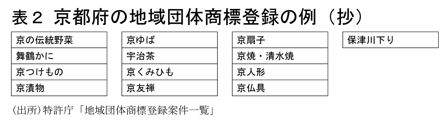観光地としての京都の総合的なブランドと並んで、地元産品のブランドの多さも京都の特徴である。この地元産品のブランド数を知る指標の1つとして、「地域団体商標」というものがある。これは、商品名やブランド名などの商標登録制度を管理する特許庁が行っている制度で、「地域ブランド」の保護による地域経済の活性化を目的として06年4月1日に導入」されたものである。