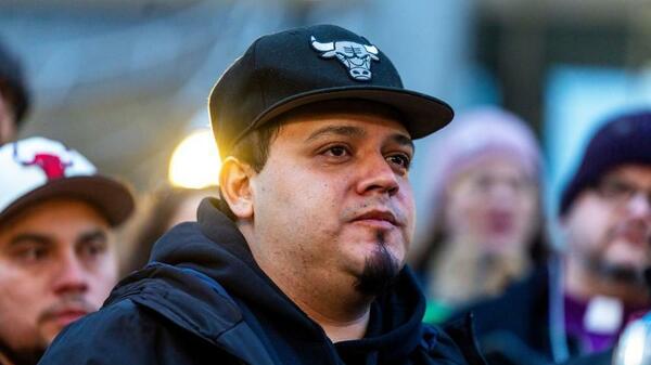 釈放の翌日、移民関税執行局(ICE)事務所へ定期出頭する前に支援者と集会に参加したアブレゴ=ガルシア氏(12日、米メリーランド州ボルティモア)
